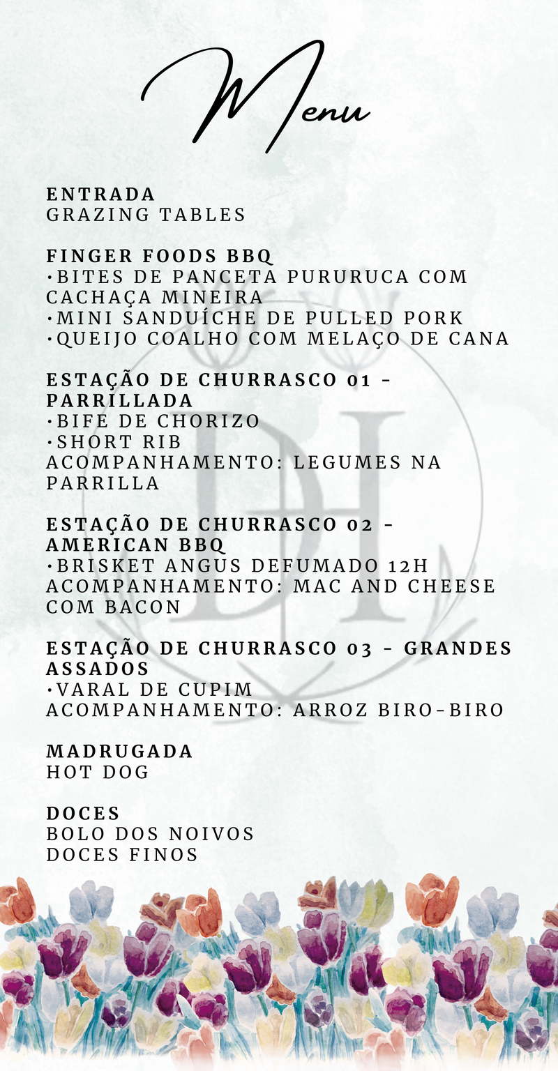 Nosso buffet será finger food, pensado para que vocês curtam a festa com conforto e sem pressa! Teremos mesas de frios como entrada, seguidas de estações de churrasco no estilo festival, além de deliciosos pratos finger food para saborear ao longo da noite. Para acompanhar, chope gelado e um bar repleto de drinks incríveis. E, claro, não deixem de provar nosso welcome drink, que tem a cara do casal! Conseguem advinhar o que é? 🤭
